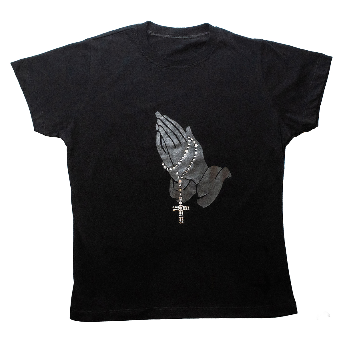 A estampa de terço combina strass termocolante premium (brilho AAA), detalhes metalizados e impressão digital, criando um visual luminoso, impactante e resistente. Cada pedra é aplicada individualmente com calor, formando um acabamento impecável e sofisticado, ideal para moda cristã, evangélica e católica.