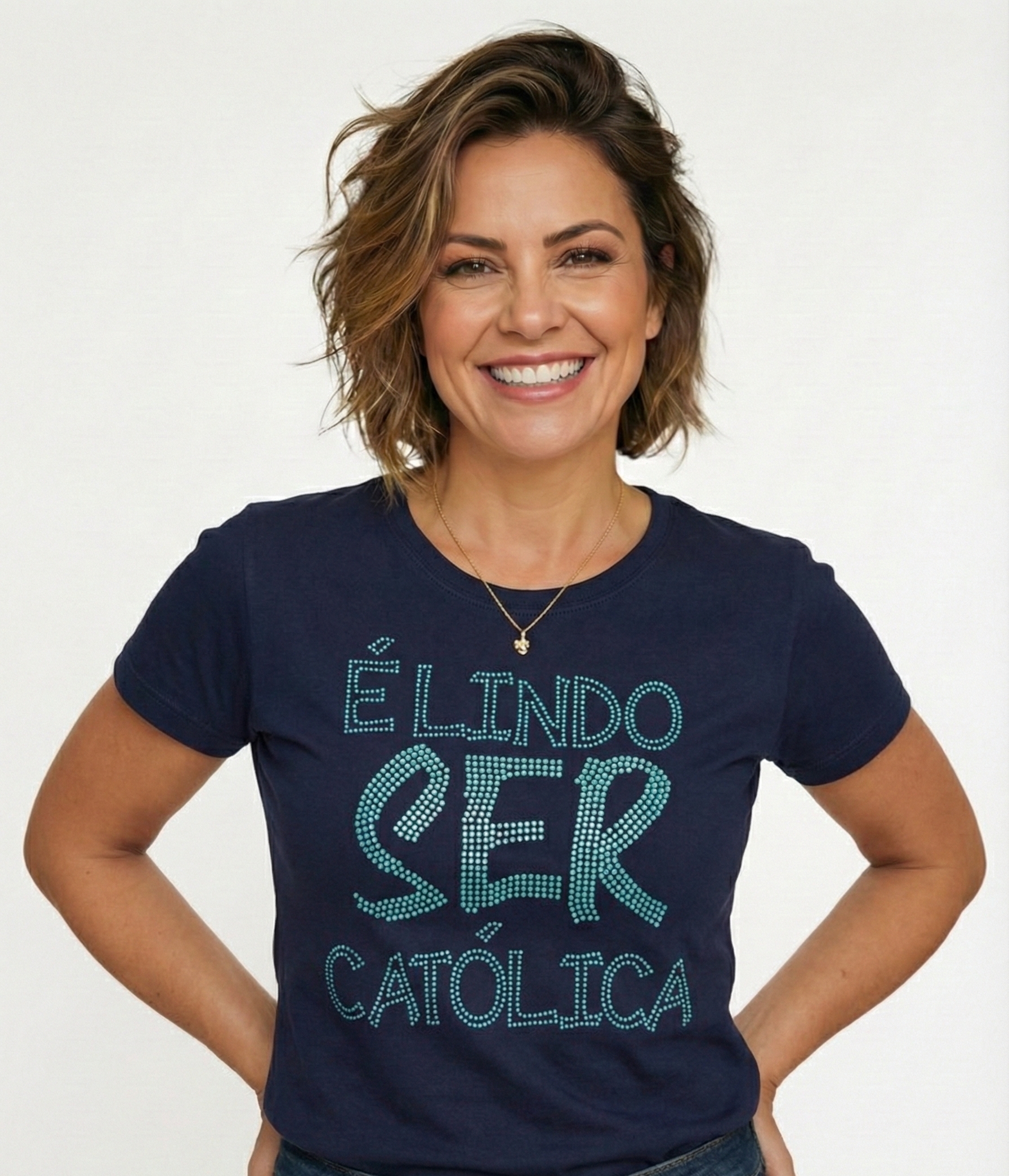 Expresse o orgulho da sua fé com sofisticação. Esta peça exclusiva da Moda Católica traz a frase "É Lindo Ser Católica" desenhada em aplicações de pedraria (strass) de alto brilho, transformando uma camiseta básica em uma peça elegante para missas, encontros e o dia a dia.