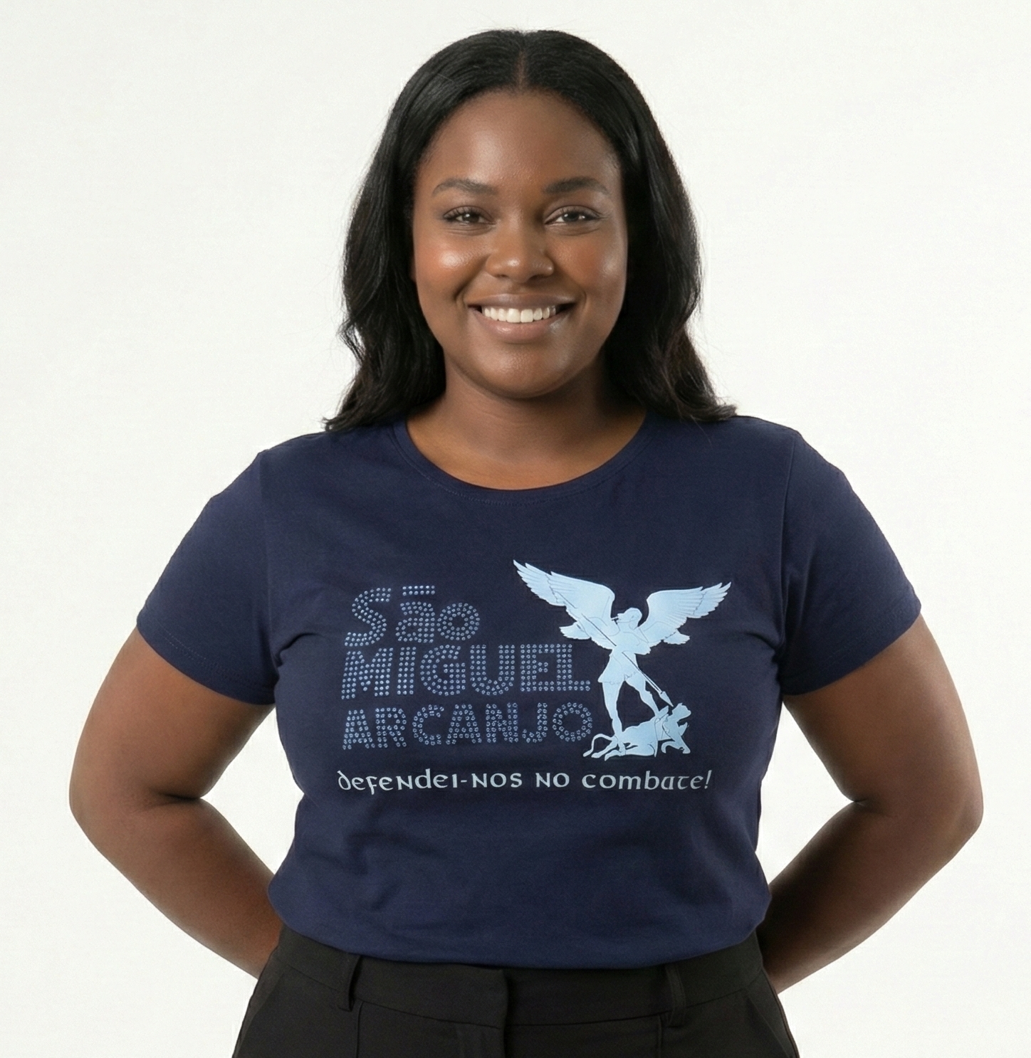 Sinta-se protegida e elegante com a nossa Blusa Plus Size Religiosa de São Miguel Arcanjo. Desenvolvida especialmente para valorizar suas curvas com conforto, esta peça traz a poderosa oração "Defendei-nos no combate". O destaque fica por conta da aplicação em pedraria (strass) de alto brilho, unindo a fé inabalável à sofisticação da Moda Católica Plus Size.