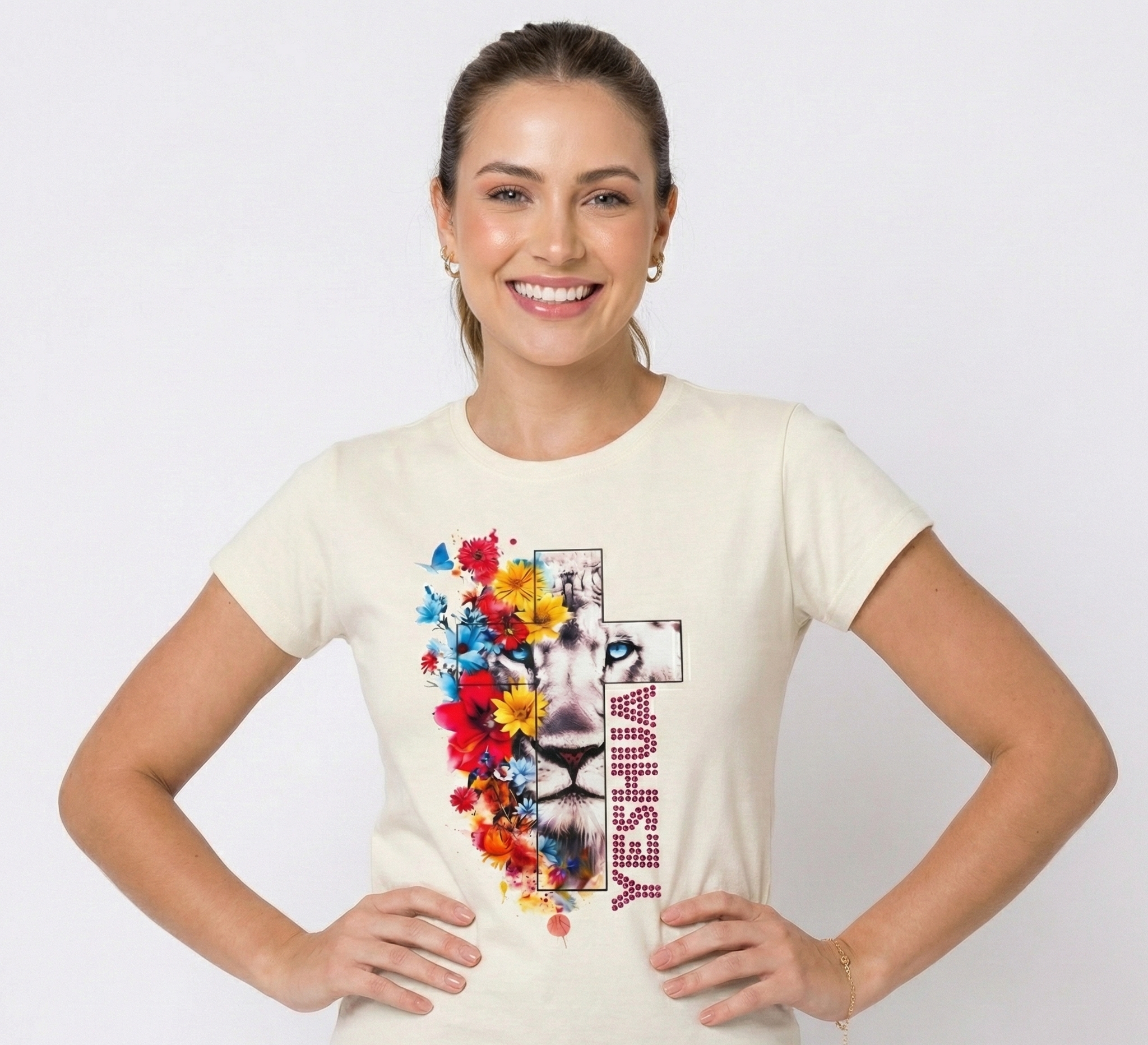 Vista sua fé com elegância e sofisticação incomparável. Esta peça exclusiva une a força do Leão de Judá com a delicadeza das flores e o brilho intenso da escrita YESHUA em Cristais de Strass. Desenvolvida para a mulher cristã que não abre mão de conforto e qualidade premium.