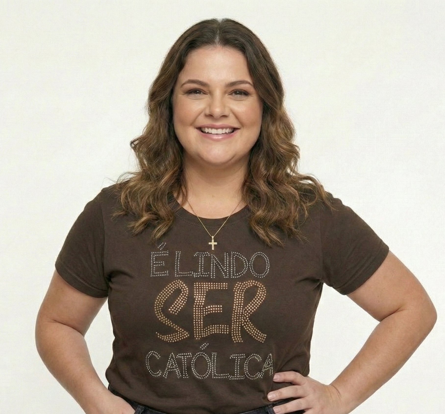 Declare o orgulho da sua fé com a nossa T-shirt Plus Size Católica. Com a frase "É LINDO SER CATÓLICA" estampada em aplicações de alto brilho (strass), esta peça ilumina seu visual e transmite uma mensagem poderosa de identidade e devoção. Perfeita para usar na missa, em encontros de jovens, retiros ou no dia a dia para evangelizar com elegância.