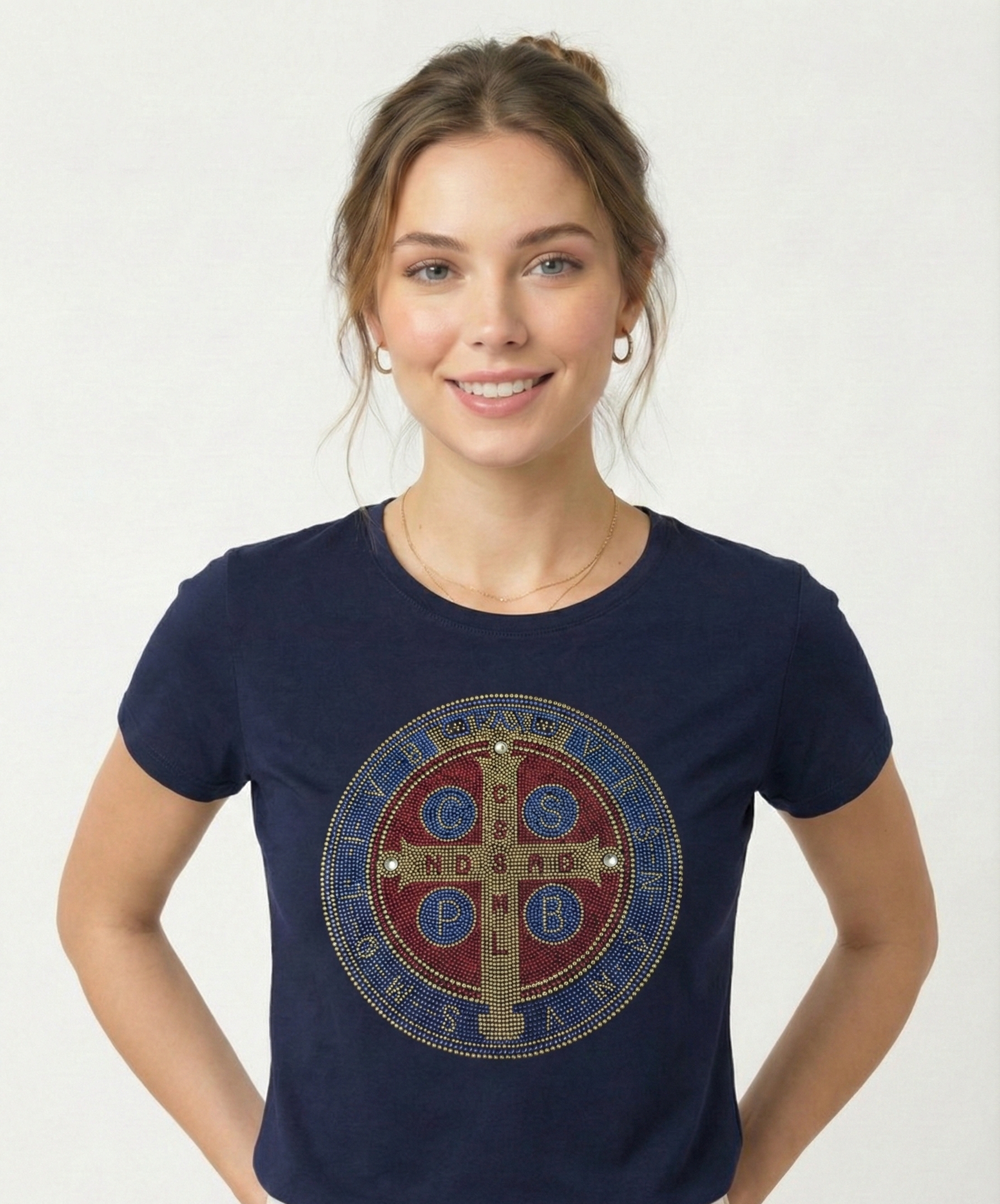 Una fé, proteção e estilo com esta exclusiva Baby Look da Medalha de São Bento. Desenvolvida especialmente para a mulher católica que deseja expressar sua devoção no dia a dia com elegância. A estampa apresenta a medalha sagrada detalhada em pedraria de alto brilho e strass colorido, simbolizando a "Cruz Sagrada seja minha Luz".